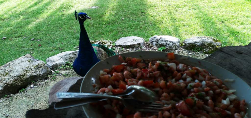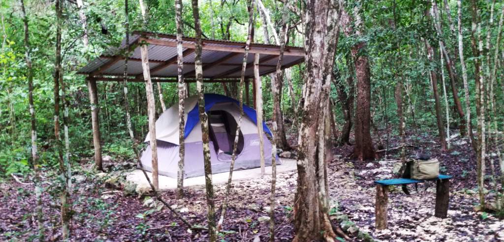 Auf dem Weg nach Calakmul (nur über eine 60 km lange Stichstraße erreichbar) liegt bei KM 7 eine Abzweigung zu einem Ökocamp. Noch zwei Kilometer unbefestigt über Stock und Stein und dann gibt es ein Haupthaus und liebevoll überdachte Zelte. Mitten im Dschungel. Der Wirt meinte, klar gebe es Affen, aber Jaguare hätten sie länger schon nicht mehr gesehen.